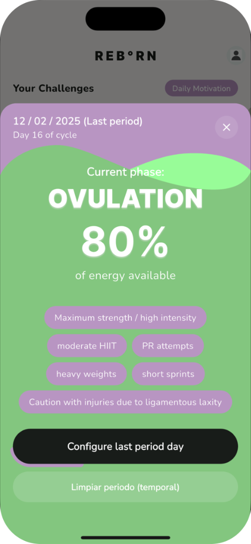 REB°RN adapts recommendations based on your energy levels and menstrual cycle phase.
